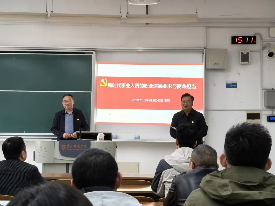 曹明处长以《新时代事业单位工作人员的职业道德要求与使命担当》为题,从新时代事业单位人员的职业道德现状、应具备的职业道德规范以及如何践行使命担当三个层面展开系统阐述,并结合高校管理工作的实际特点进行针对性深入论述。他以“全国优秀教师”“第四届全国道德模范”王强教授为典范,生动展现了高校教师坚守教育初心、恪尽职守的优良作风,并强调当前高校的核心使命是“为党育人、为国育才”。他强调,高校管理人员应将职业道德要求切实融入教学管理、科研服务、人才培养等各项具体工作中,以过硬的作风和务实的举措扛起办学治校的使命担当。